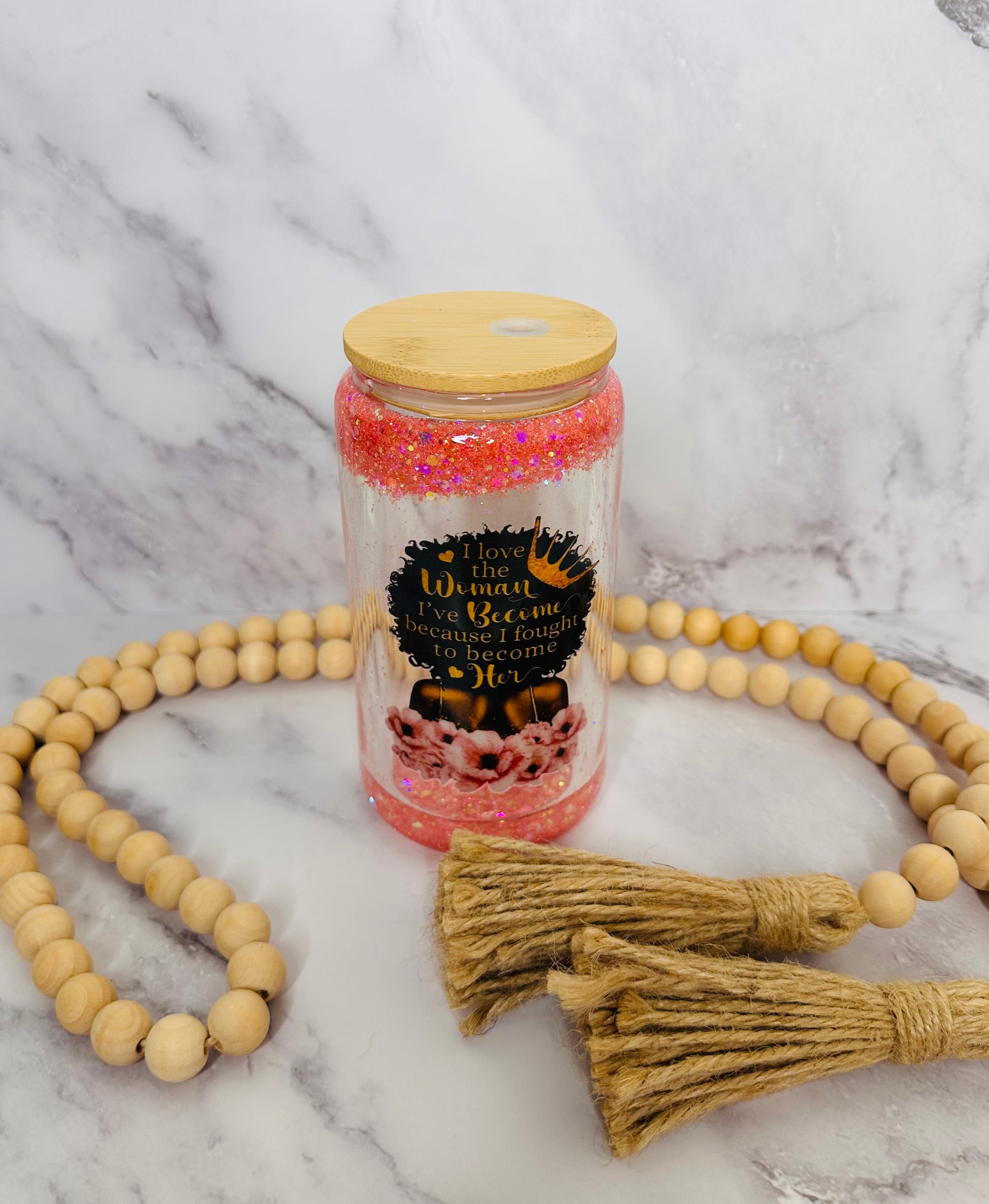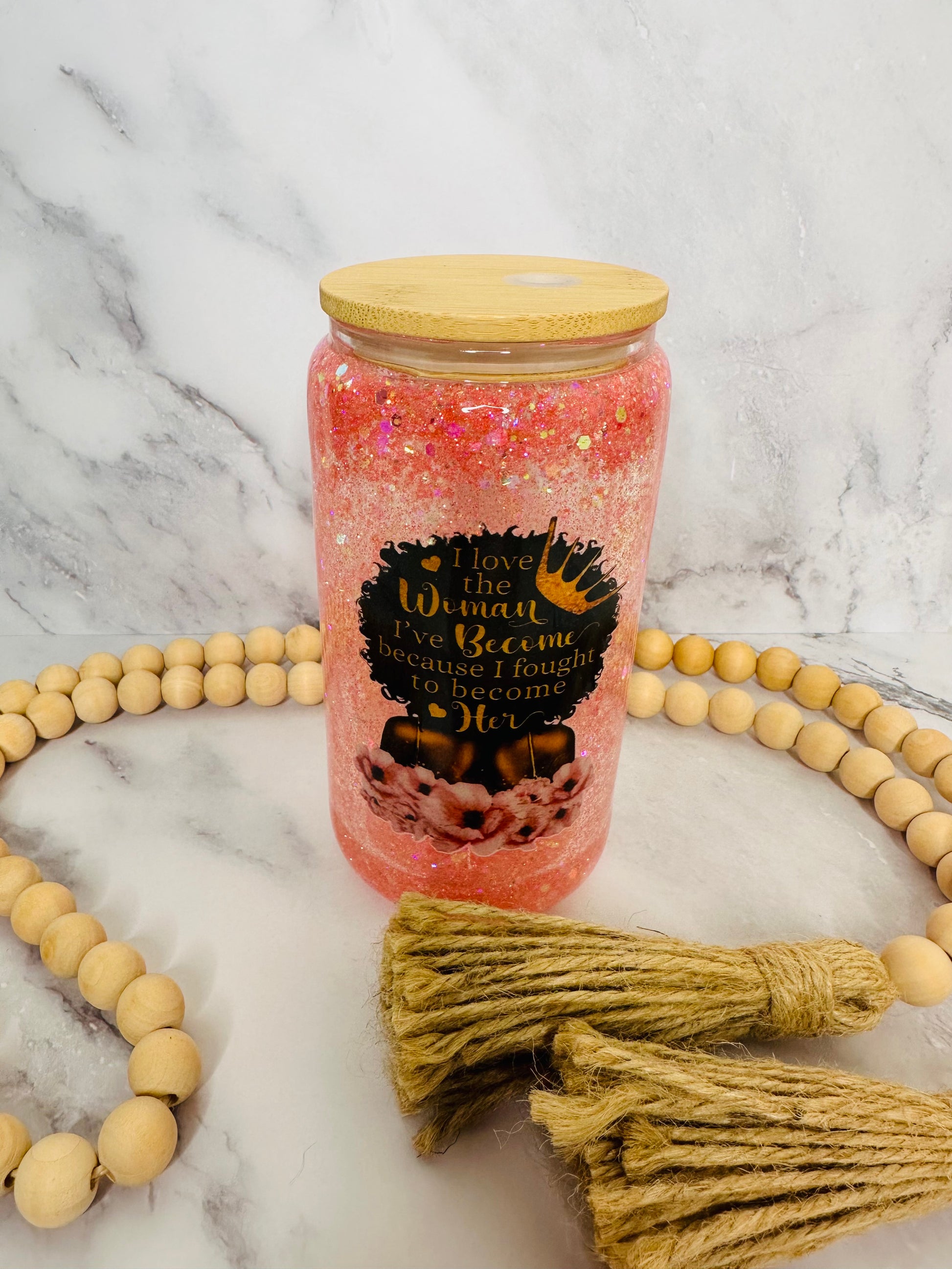 "Love the woman I've become" 16 oz glass snowglobe tumbler, complete with bamboo lid and a reusable straw.